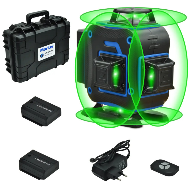 Marker 4D-360 – лазерний нівелір, крослайнер із чотирма площинами 360° (2 вертикальні та 2 горизонтальні площини - тобто, 16 ліній) зеленого кольору. Це універсальний інструмент для ремонтних, будівельних та оздоблювальних робіт, який гарантує ідеальну точність навіть у складних умовах.