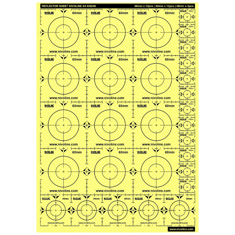 NIVOLINE A4 602040 - плівковий відбивач застосовується для роботи з будь-якими типами електронних тахеометрів. Він являє собою спеціально розмічену самоклеючу плівку зі світловідбиваючою поверхнею. На форматі А4 розміщені марки розміром: 60 x 60 мм - 12 шт., 20 x 20 мм - 12 шт. та 40 x 40 мм - 5 шт.