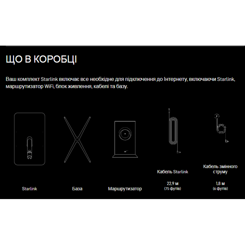 Ви зможете зібрати та налаштувати модем Starlink самостійно та дуже швидко. У базовий комплект Starlink Internet Satellite Dish Kit V2 входить сам модем, маршрутизатор WiFi, а також база для встановлення та необхідні кабелі – усе, що потрібно для збірки.